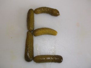 After unsuccessfully drawing pickle-shaped letters, I decided I would use some actual pickles for a “pickle photo shoot”. My daughters and I experimented with a variety of pickles, but in the end we all agreed that the little whole pickles looked the best as letters. Although we got a little sticky, we had fun finding the perfect pickles to create the various letters to spell the word PICKLES. We arranged the pickles into each individual letter (P-I-C-K-L-E-S) on a white cutting board so that I could take a few pictures of each of them using my digital camera. Once we had a picture worth keeping for the letter, we moved on to assembling the next letter. Here are a couple of pickled letters: